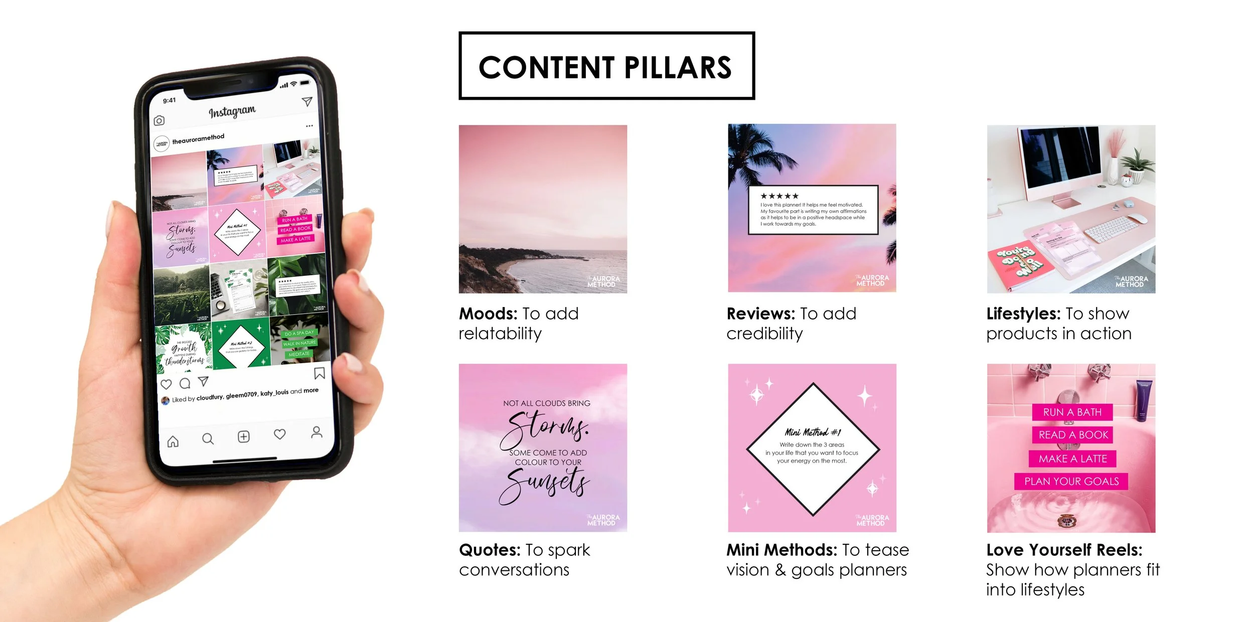 The Aurora Method is an Etsy Shop with products that include vision and goal planners and prints. These printable planners were designed to guide customers to learn how to identify their values, write goals and affirmations, self-reflect, and how to craft the life of their dreams. As part of this project, I created the logo, look and feel, the layout of each vision and goal planner. I also designed the web banners for the Etsy shop, affirmation prints, and content for social media. Each of the designs (Pink Dreams, Tropical Greens and Aura Crystals) were hand painted using watercolour paints, then modified and refined using Adobe Photoshop and Illustrator. The page layouts were designed using Adobe InDesign.
